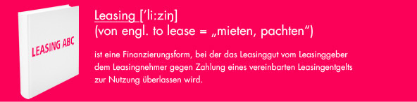 Juristisch gesehen ist Leasing eine Form der Miete von Investitionsgütern oder langlebigen Gütern. Finanzwirtschaftlich betrachtet versteht man unter Leasing die Nutzungsüberlassung eines